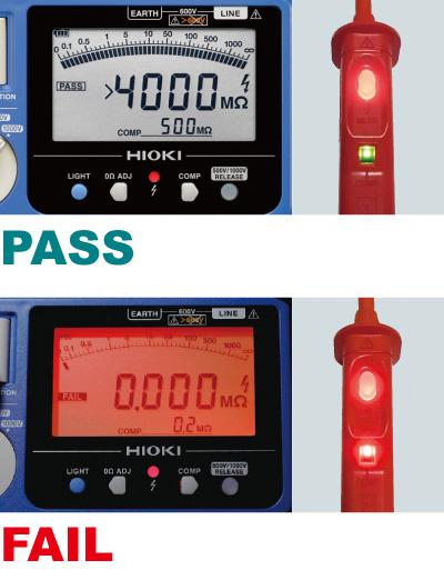 Compare measured values to pre-set reference values to generate a pass or fail judgment with the Comparator function. (also pair with insulation resistance measurement and low-resistance measurement) The insulation testers give you pass/ fail results using a beeping sound, LCD light, and indication right on the test lead with remote control switch (option), letting you check for insulation integrity without needing to look at the instrument.