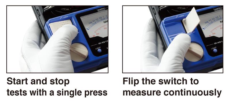 The instrument’s measurement switch can be operated with just the thumb. Press for a single measurement or lift up for continuous measurement of insulation resistance.